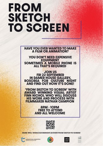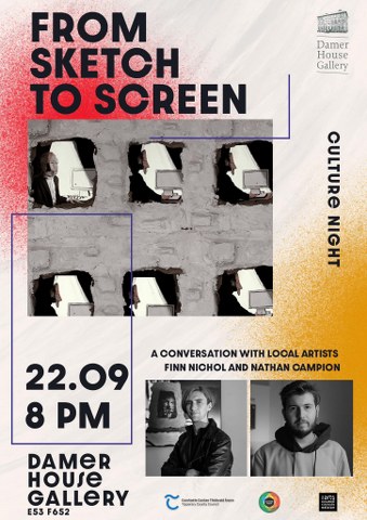 Culture Night at Damer House Gallery. From Sketch to Screen. Join Finn Nichol and Nathan Campion at 8pm on 22 September in the annex of Damer House. It's going to be a fun chat between two friends, delving deep into Finn's unique artistic process, including a few pieces they collaborated on. There will screenings of some of Finn's best pieces. It's shaping up to be an enjoyable night, and we hope to see you there!
