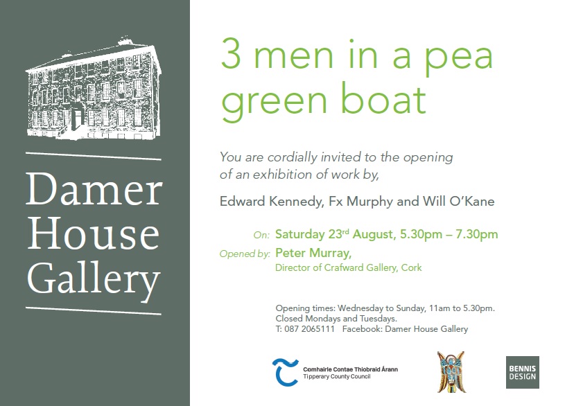 The exhibition "3 men in a Pea Green Boat" opened on 23 August 2014 featuring work by Eddie Kennedy, FX Murphy and Will O'Kane.
