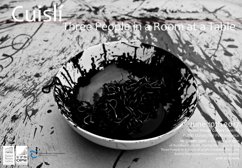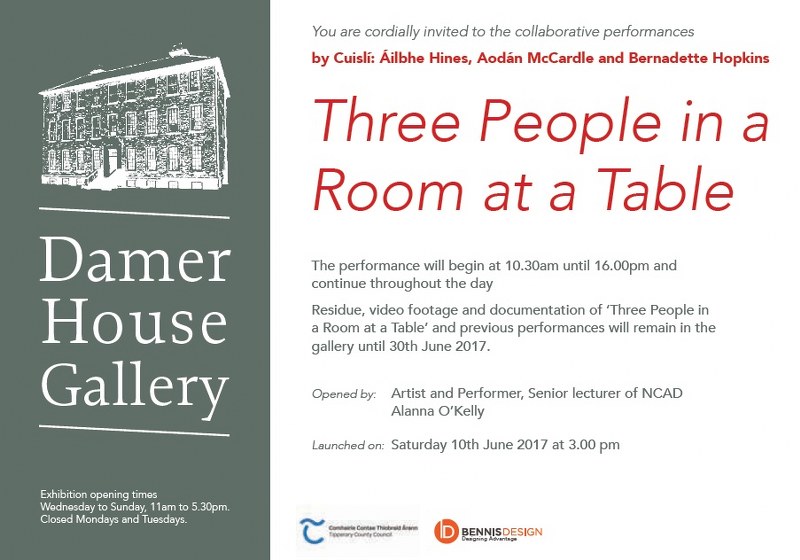 Three People in a Room at a Table by Cuislí: Áilbhe Hines, Aodán McCardle and Bernadette Hopkins. Opened by: Artist and Performer, Senior lecturer of NCAD Alanna O’Kelly